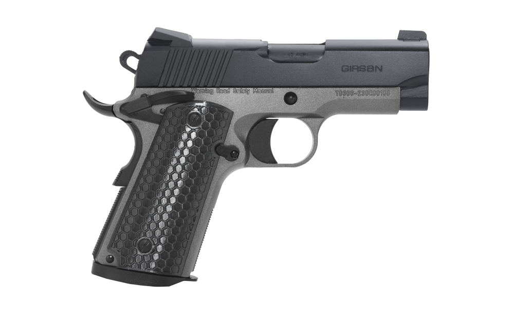 This model is the SC variant and features a two-tone gray and black finish pattern, a subcompact style 1911 frame and a 3.4-inch barrel. It is chambered in .45 ACP and includes one 6-round magazine.