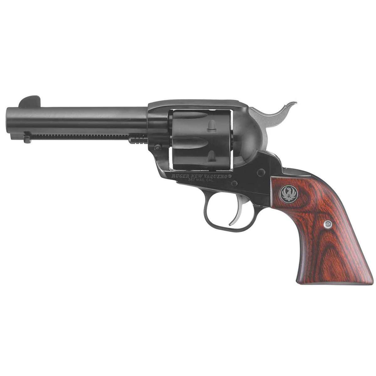 Ruger Vaquero 357 Magnum 4.62in Blued Revolver – 6 Rounds – The Ruger Vaquero is often referred to as “the gun that won the New West” because of its widespread popularity among single-action shooters and cowboy action competitors. It combines the original Old West single-action look and feel with modern features. The mid-size steel frame and cylinder are scaled-down to the same size as the original 1955 Ruger Blackhawk, closely resembling the classic single-action revolvers of the late 1800’s.