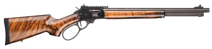 The Model 1854 is a modern revival of Smith & Wesson’s Volcanic series of lever-action rifles. The rifle features a flat trigger design favored by competition shooters to aid in more consistent trigger finger placement that is combined with a large loop lever for easier manipulation while wearing gloves. The magazine tube is also removable to allow for quick and safe unloading of the firearm and is paired with a loading gate for quick reloading during use. These features are combined with a threaded barrel and top-mounted 1913 Picatinny rail for quick and easy attachment of muzzle devices and optics.