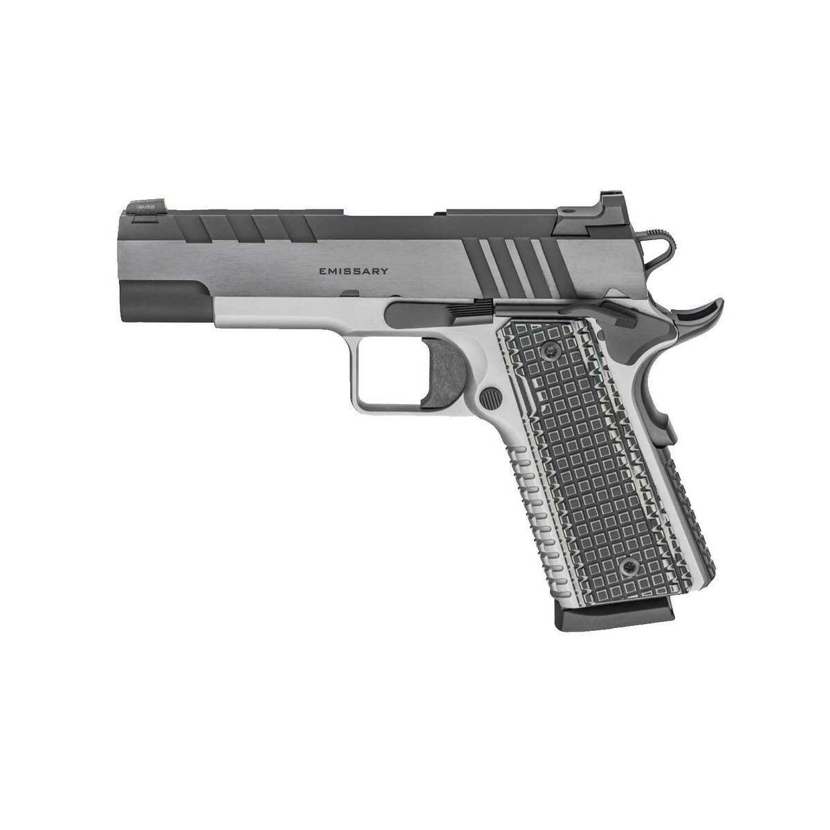 Springfield Armory 1911 Emissary 45ACP 4.25in Stainless Pistol – 8+1 Rounds – Combining compact dimensions with qualities inspired by custom-grade 1911 pistols, the Emissary 4.25” in .45 ACP is ready for everyday carry. Its Tri-Top slide features light-diffusing 40 line-per-inch serrations along the sighting plane, and a heavy-profile forged stainless steel bull barrel ensures maximum accuracy. With a forged hot salt blued slide and forged stainless steel frame with squared triggerguard and grenade-pattern checkering, you get a pistol ready for display or defense.