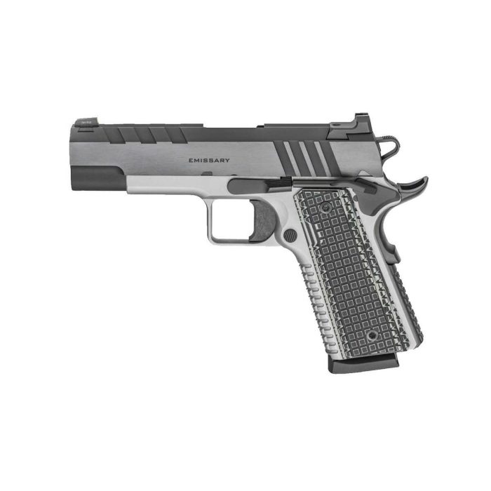 Springfield Armory 1911 Emissary 45ACP 4.25in Stainless Pistol – 8+1 Rounds – Combining compact dimensions with qualities inspired by custom-grade 1911 pistols, the Emissary 4.25” in .45 ACP is ready for everyday carry. Its Tri-Top slide features light-diffusing 40 line-per-inch serrations along the sighting plane, and a heavy-profile forged stainless steel bull barrel ensures maximum accuracy. With a forged hot salt blued slide and forged stainless steel frame with squared triggerguard and grenade-pattern checkering, you get a pistol ready for display or defense.