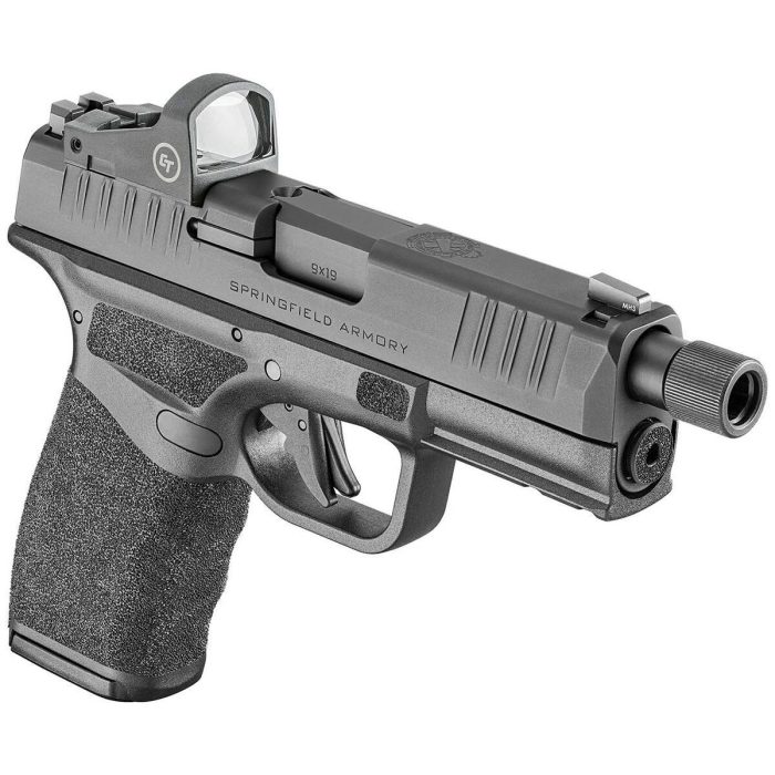 Springfield Armory Hellcat Pro OSP Threaded with Crimson Trace CTS-1500 Red Dot 9mm Luger 4.4in Black Melonite Pistol – 17+1 Rounds – Designed around a flush fitting 15-round magazine the Threaded Hellcat Pro with bundled Crimson Trace CTS1500 Red Dot and offers all the advantages of an optic-equipped handgun. Offering the perfect balance between concealability and capacity, the pistol is chambered in 9mm Luger and includes one (1) 15-round magazine and four (4) 17-round magazine, giving shooters the ability to carry in their preferred configuration. The 4.4in hammer-forged barrel features 1/2 x 28 threading, allowing users to attach various muzzle devices. This pistol delivers fast and intuitive target acquisition.